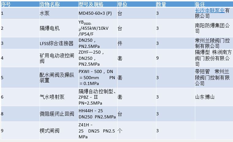 礦井主排水設(shè)備供貨一覽表:
