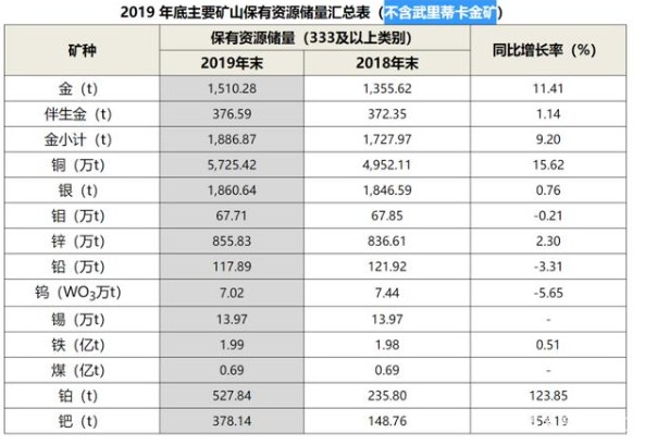 截止到2019年末,紫金礦業(yè)擁有2,130 噸金(含武里蒂卡金礦),黃金資源量超過(guò)國(guó)家央行黃金儲(chǔ)備量(截至2020 年2 月末,央行黃金儲(chǔ)備約1,948.32 噸),據(jù)《2019中國(guó)礦產(chǎn)資源報(bào)告》,中國(guó)金儲(chǔ)量為11443.49萬(wàn)噸,紫金礦業(yè)儲(chǔ)量占據(jù)全國(guó)的18.61%。